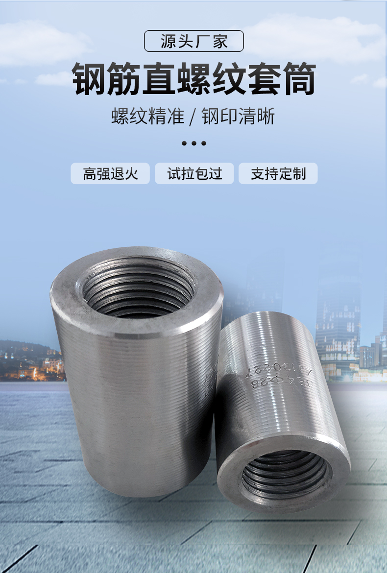 鋼筋套筒又名鋼筋接頭:用以連接鋼筋且具有與絲頭螺紋相對應內螺紋的連接件。簡單的施工流程:將鋼筋端部用滾軋工藝加工成直螺紋,并用相應的連接套筒將兩根鋼筋相互連接。