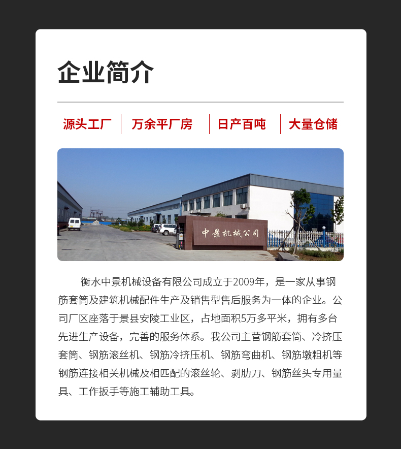 適用性強:適用于一切抗震和非抗震的鋼筋混泥土結構工程的鋼筋連接,且對彎曲鋼筋、固定鋼筋、鋼筋籠、超長鋼筋等及不能轉動的場合均適用。